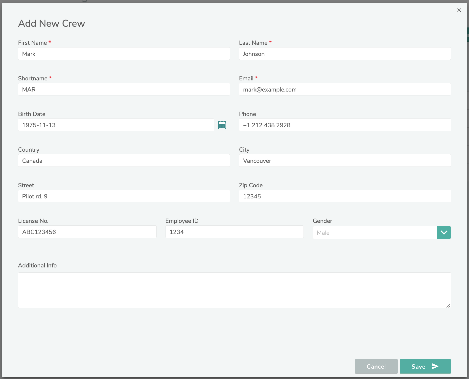To work with a crew member on a daily basis, this can be done from the Crew menu item in the main menu. On this page, you will find a list of all crew in your operation along with some search and filtering functions. When clicking on a crew a pop-up ...