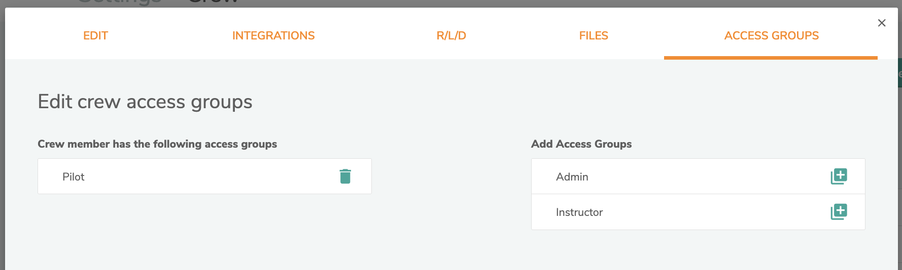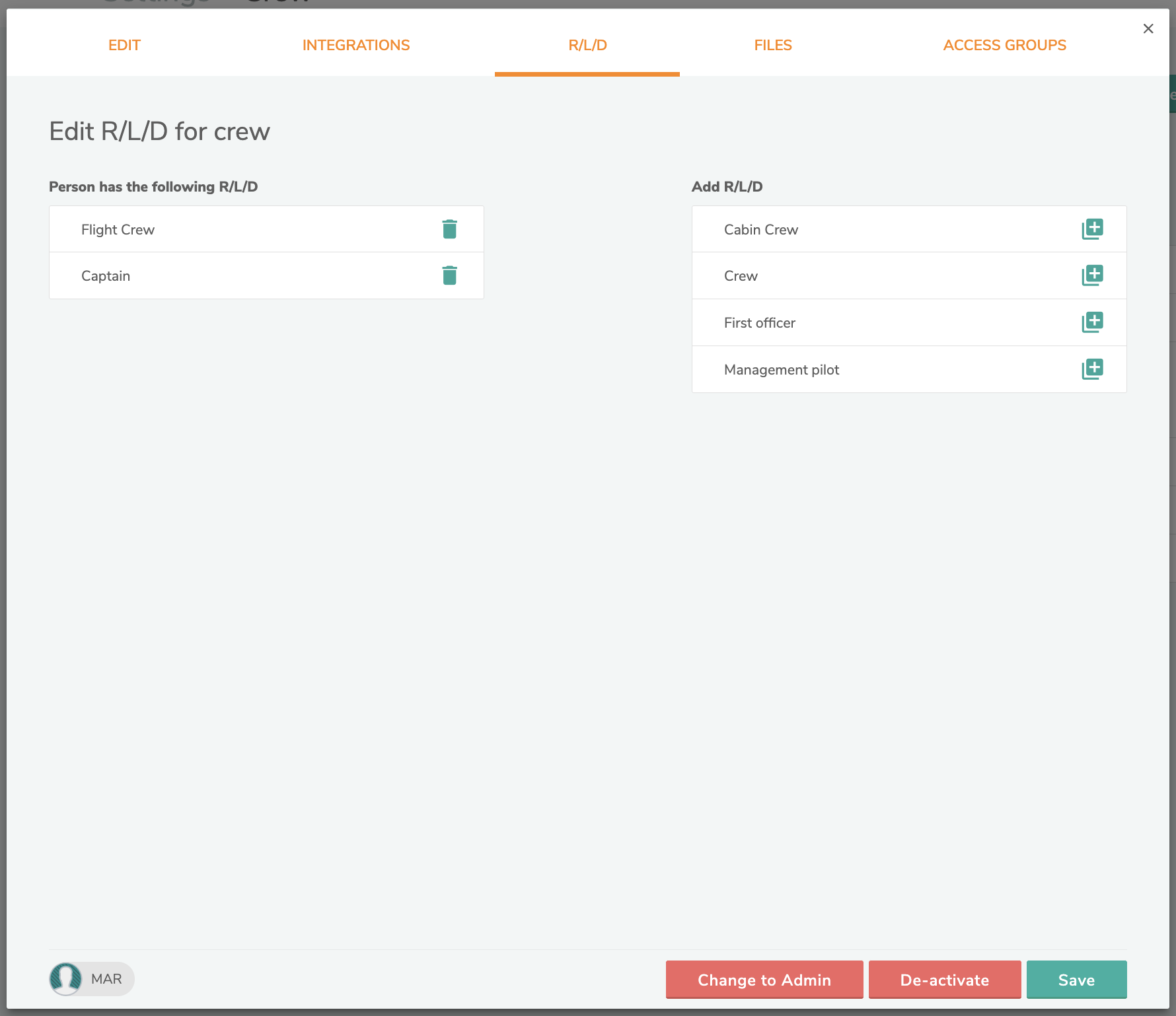 Select what type of access the crew should have by clicking the plus icon in the right list to move it to the left list. Remember to click Save when you are done.