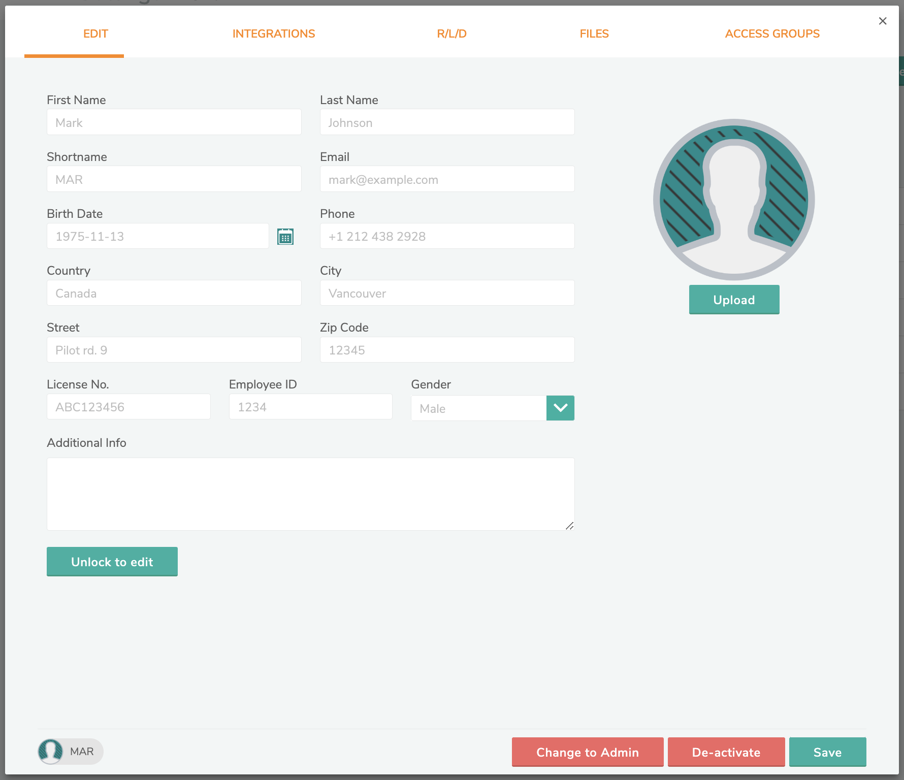 To edit any user information on this page, first click the button "Unlock to edit" which after the crew data can be updated. Once done, click save.