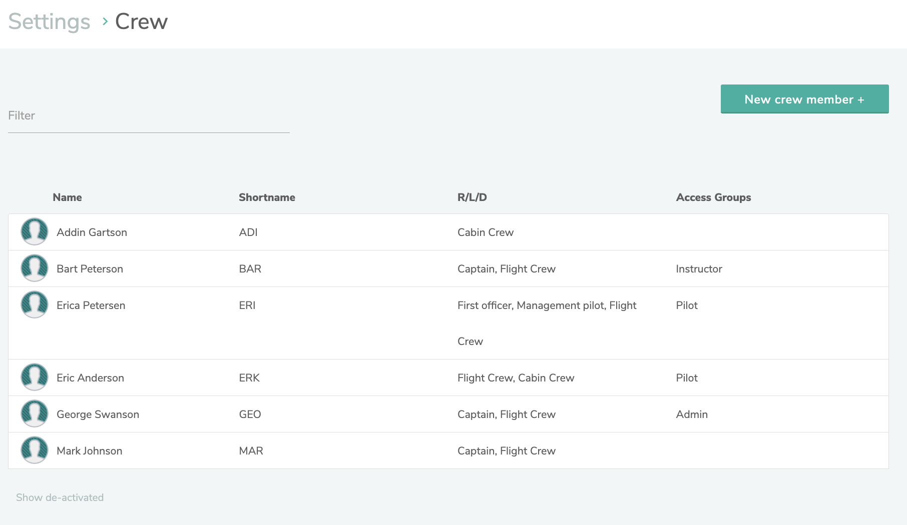 To find and re-activate a crew member that has been de-activated previously, click the "Show De-activated" link in the bottom left corner of the crew list.