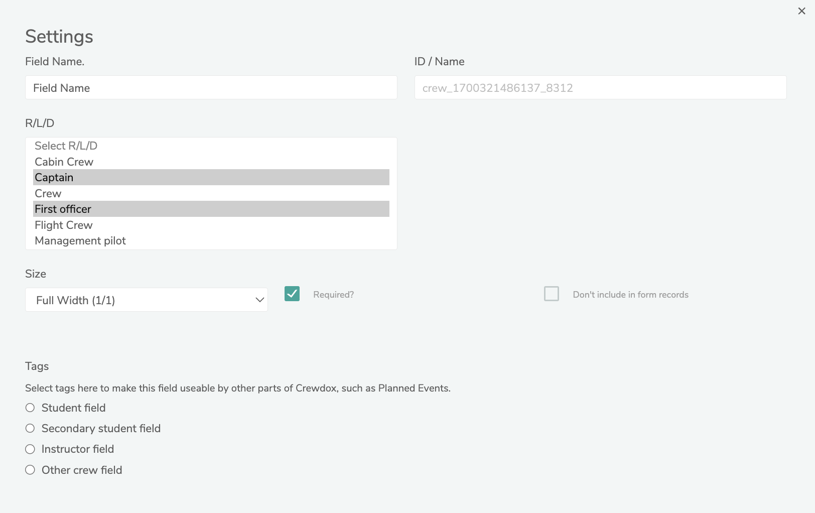 Select the roles here. Only crew that have the selected roles will be able to select when filling out the form. Use CTRL+Click on Windows or CMD+Click on a MAC to mark more than one role.