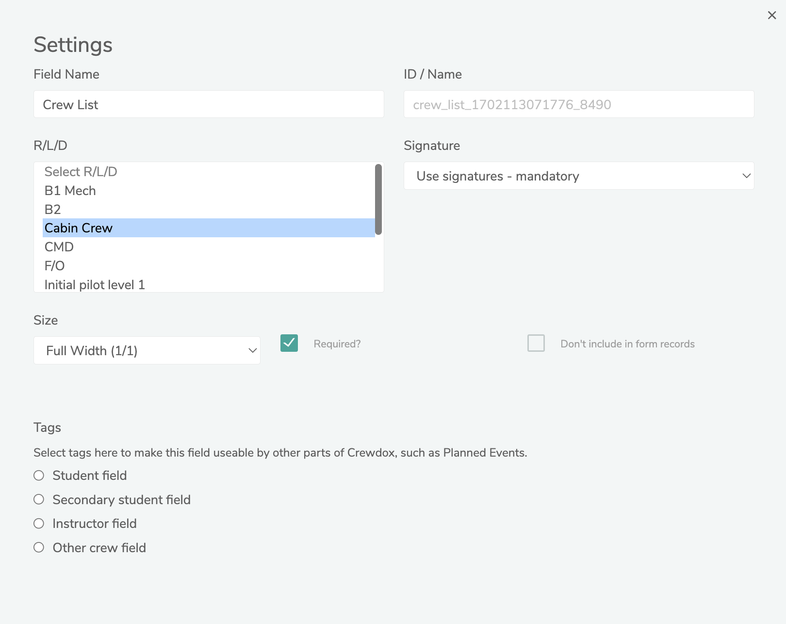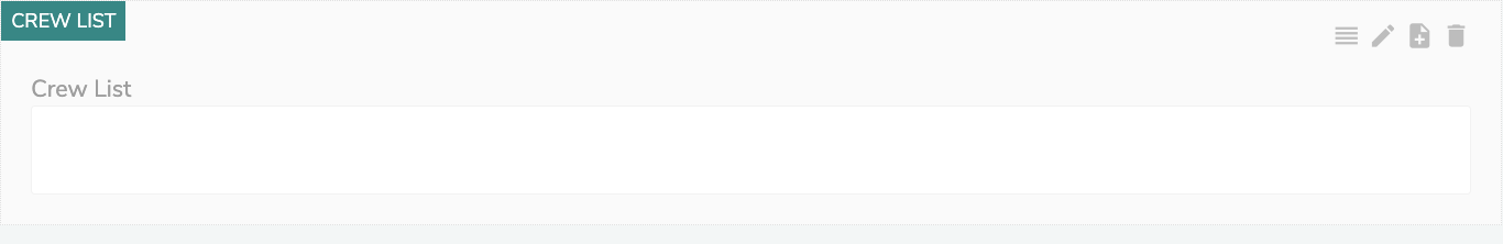 The Crew List element is intended to be used when you want to use a form as an attendance list. This element will add a dynamic crew list to the form where 1-50 crew can be selected.