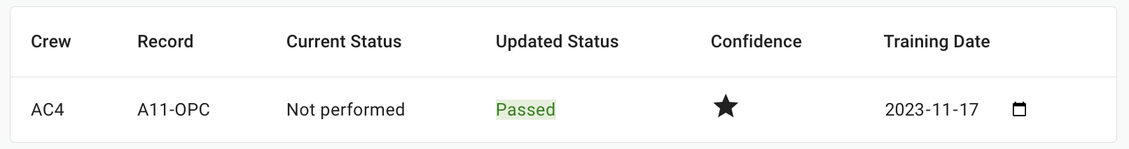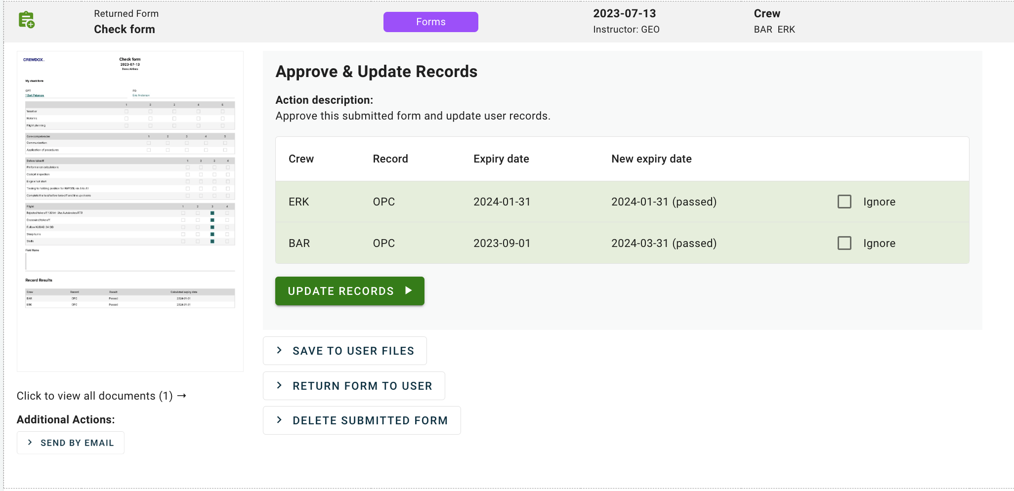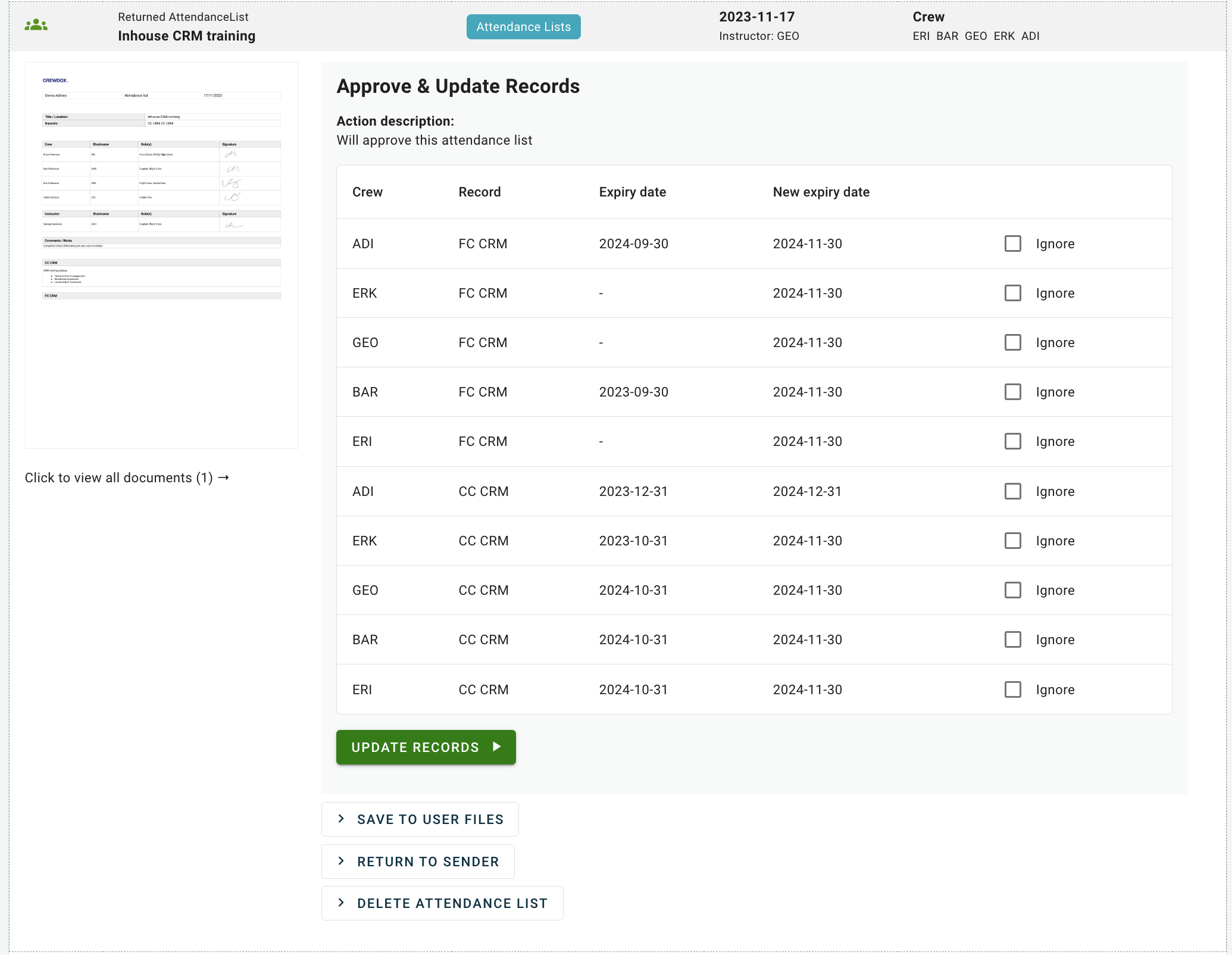 The green update records action is the default option. When clicked, all records in the list above will be updated with the attached pdf unless "Ignore" has been checked for some crew/record combination.