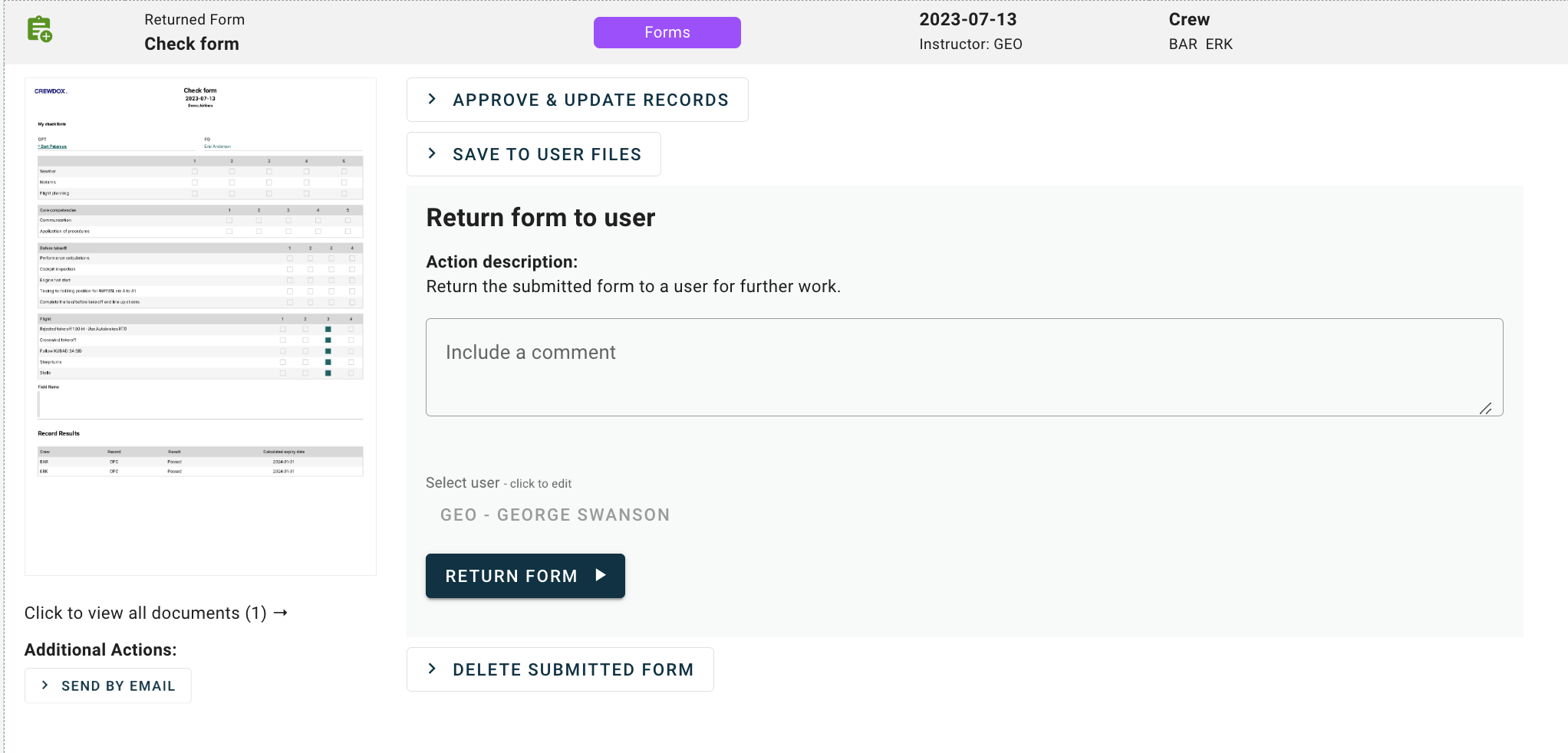 Return the form to the instructor or any other user for that matter that needs to add information or make changes to a form. A normal use case can be if a final signature from a manager is required prior to finally approving the form.