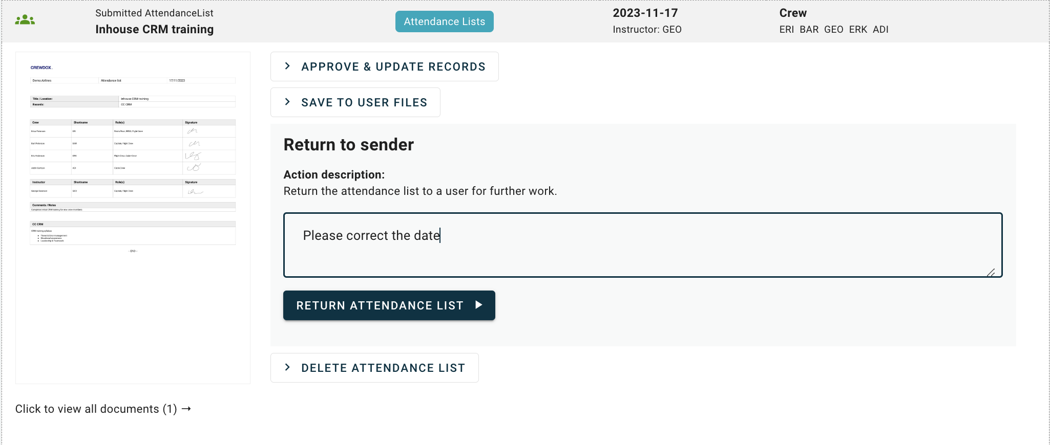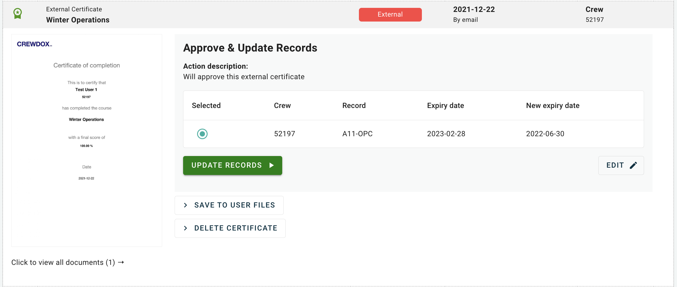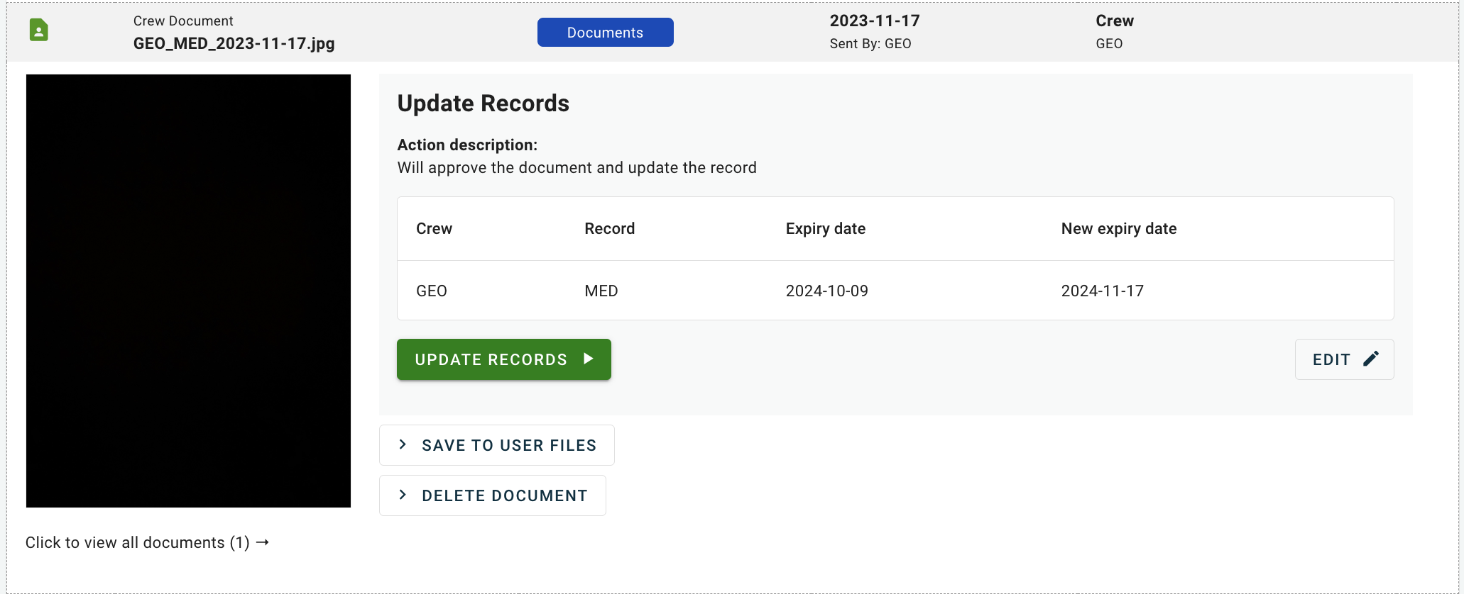 This action will not update any records, but will instead save the document in the crew files section where it can be accessed and downloaded at any time.