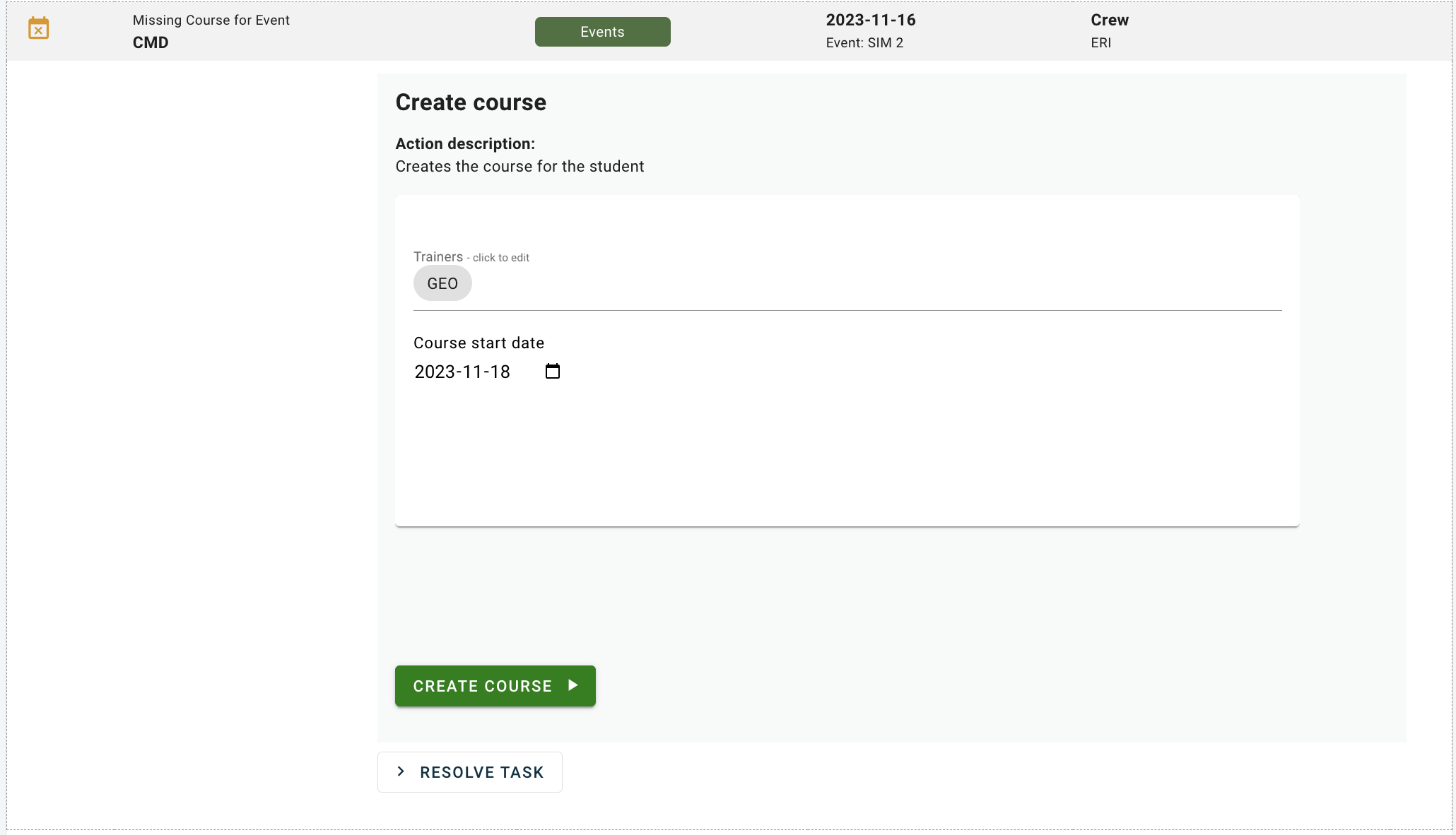 By clicking "Create course", the applicable course as set up in the event type will be created under course manager. It is possible to edit start date and trainers for the course before being created from the task list.