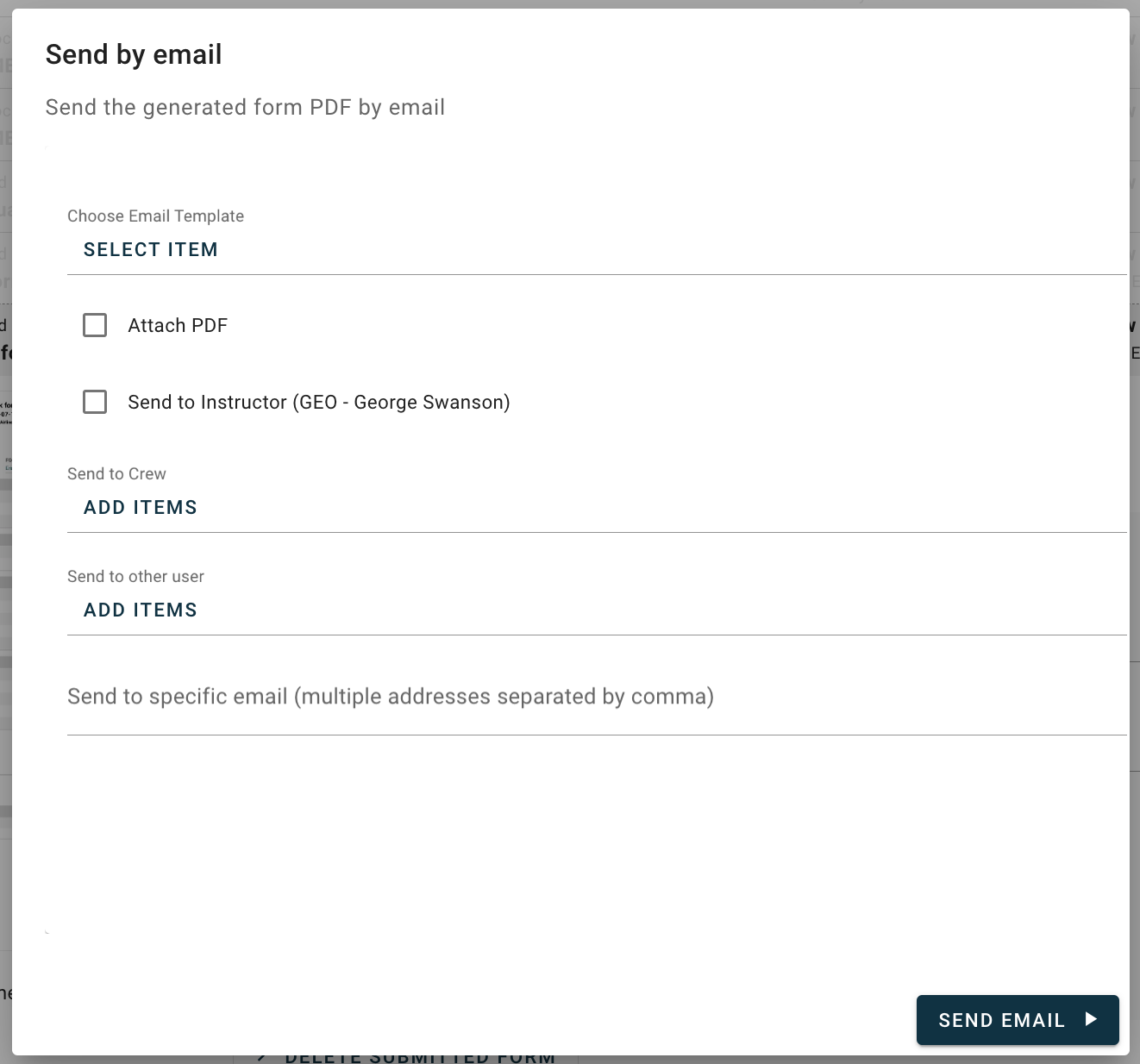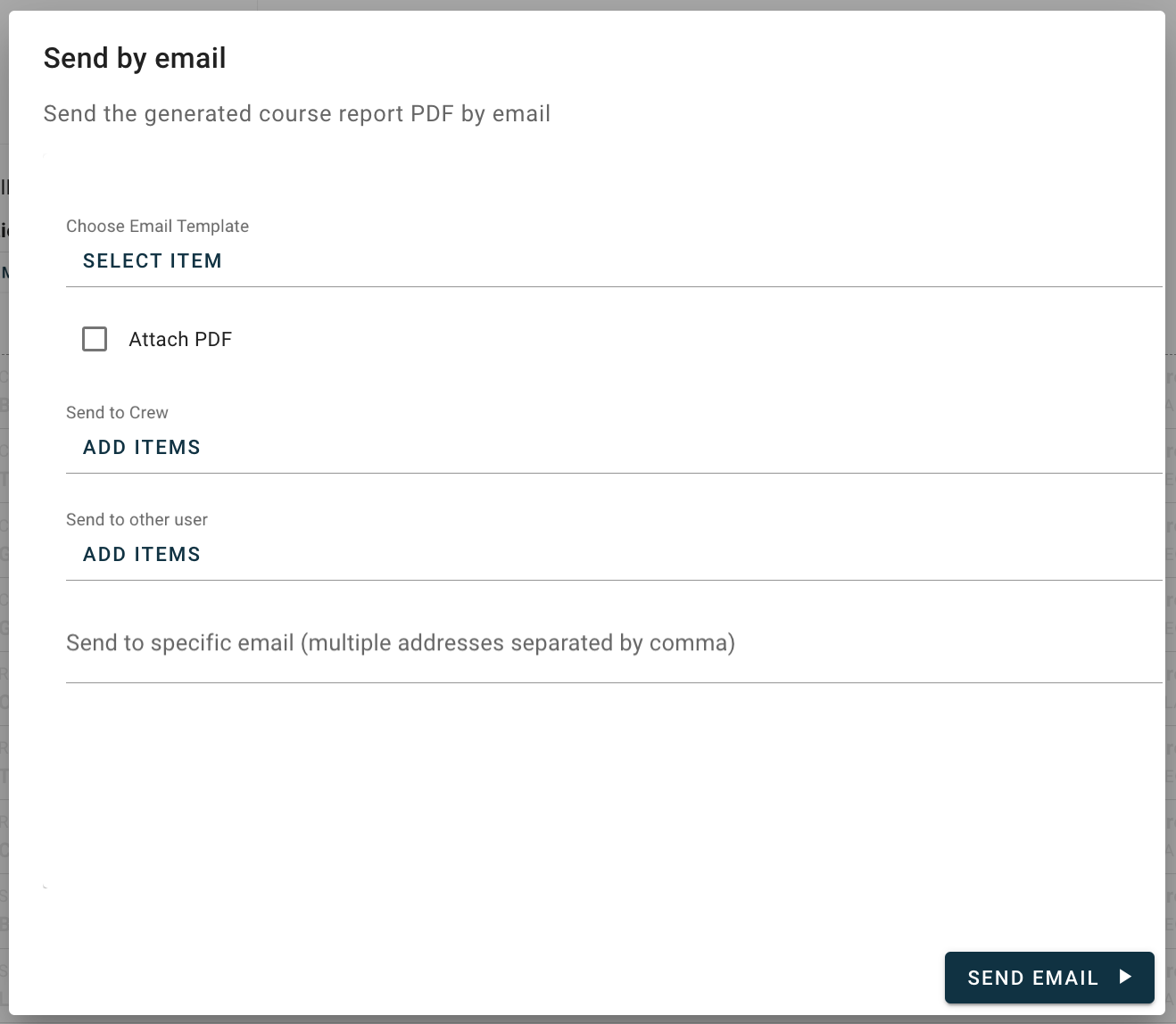 It is possible to email the course report form from the task itself by clicking the "Send by email" button. When clicked, a pop-up will open where you can specify the recipient(s) and if you want to attach the pdf or not.
