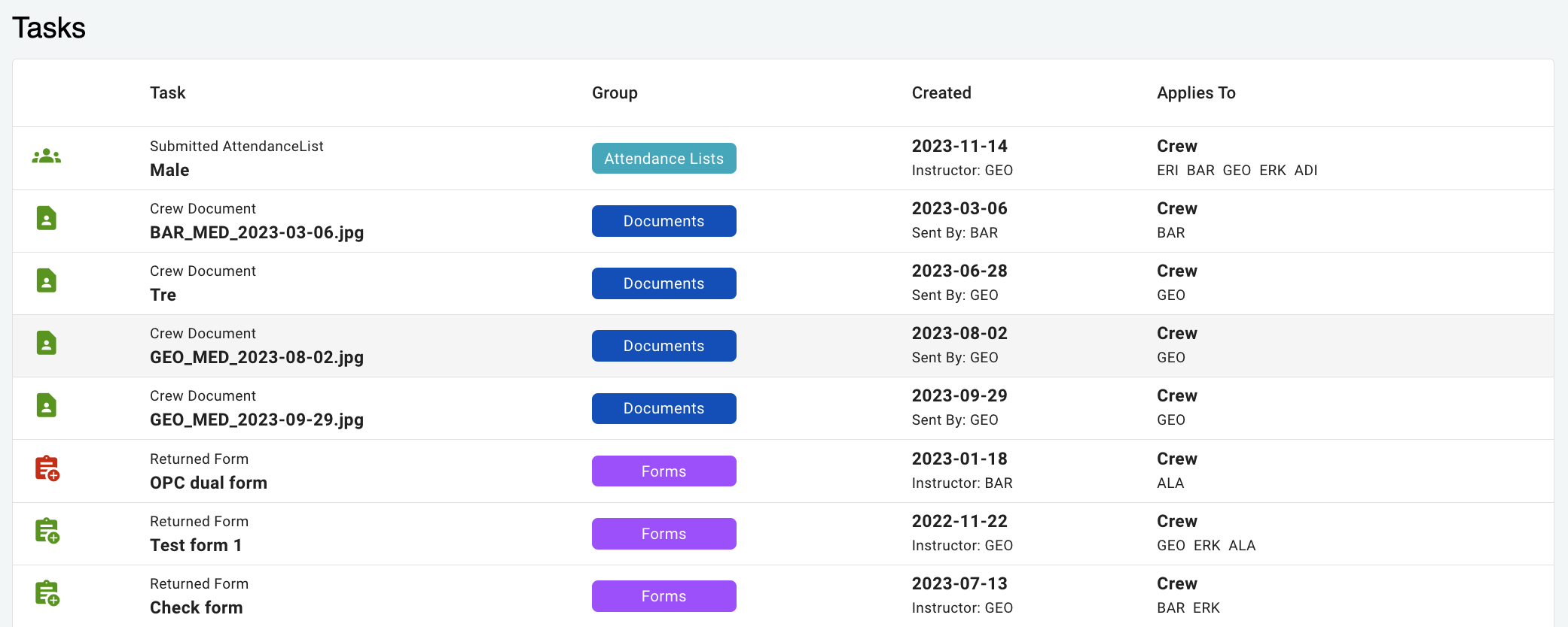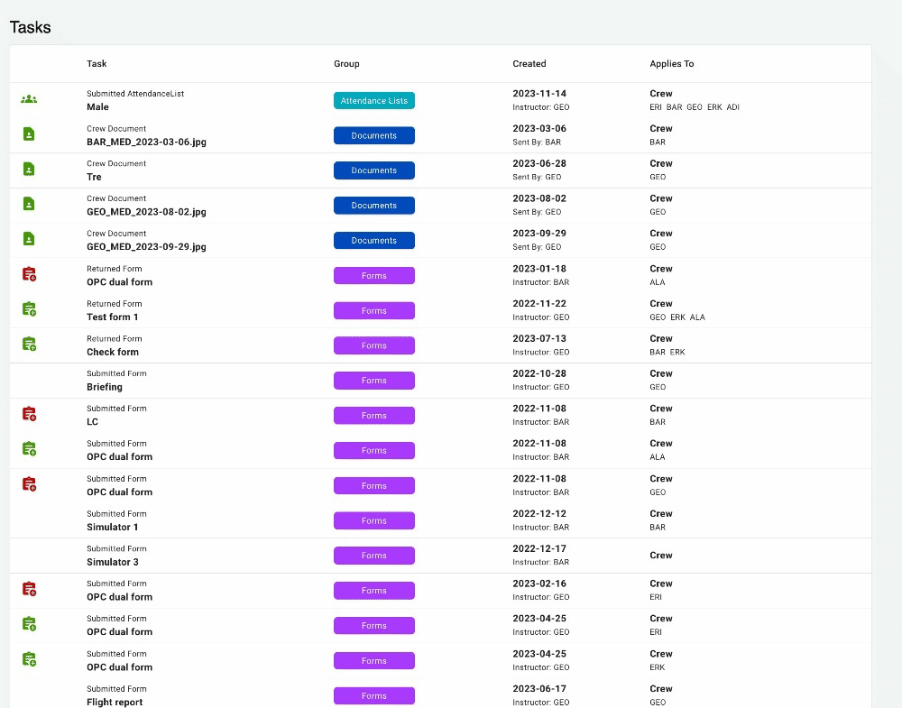 As a Crewdox administrator, you will be using the task list to handle the majority of incoming tasks. For example, when a form or attendance list has been submitted, it will come to the tasks list where you can perform certain actions based on the task type.
